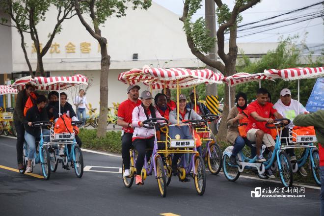 随后,师生们转场到户外,体验了一场别致的“乡间骑行打卡活动”。海沈村是两届场地自行车冠军钟天使的家乡,因此,在此处举办骑行活动具有特殊的意义。活动中,主办方带领沪上国际学生,以骑行打卡的方式领略乡村美景,感受上海浦东的新农村发展,体验改革开放的日新月异。