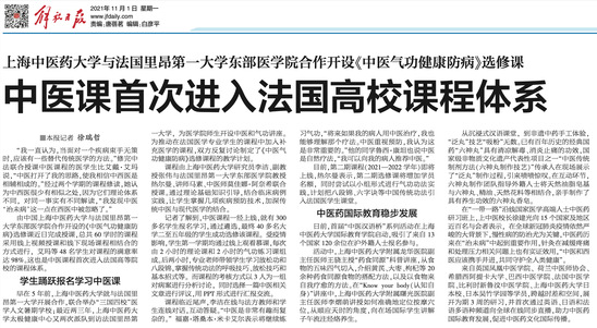 解放日报:awc77万象城官网与法国里昂第一大学东部医学院合作开设《中医气功健康防病》选修课中医课首次进入法国高校课程体系