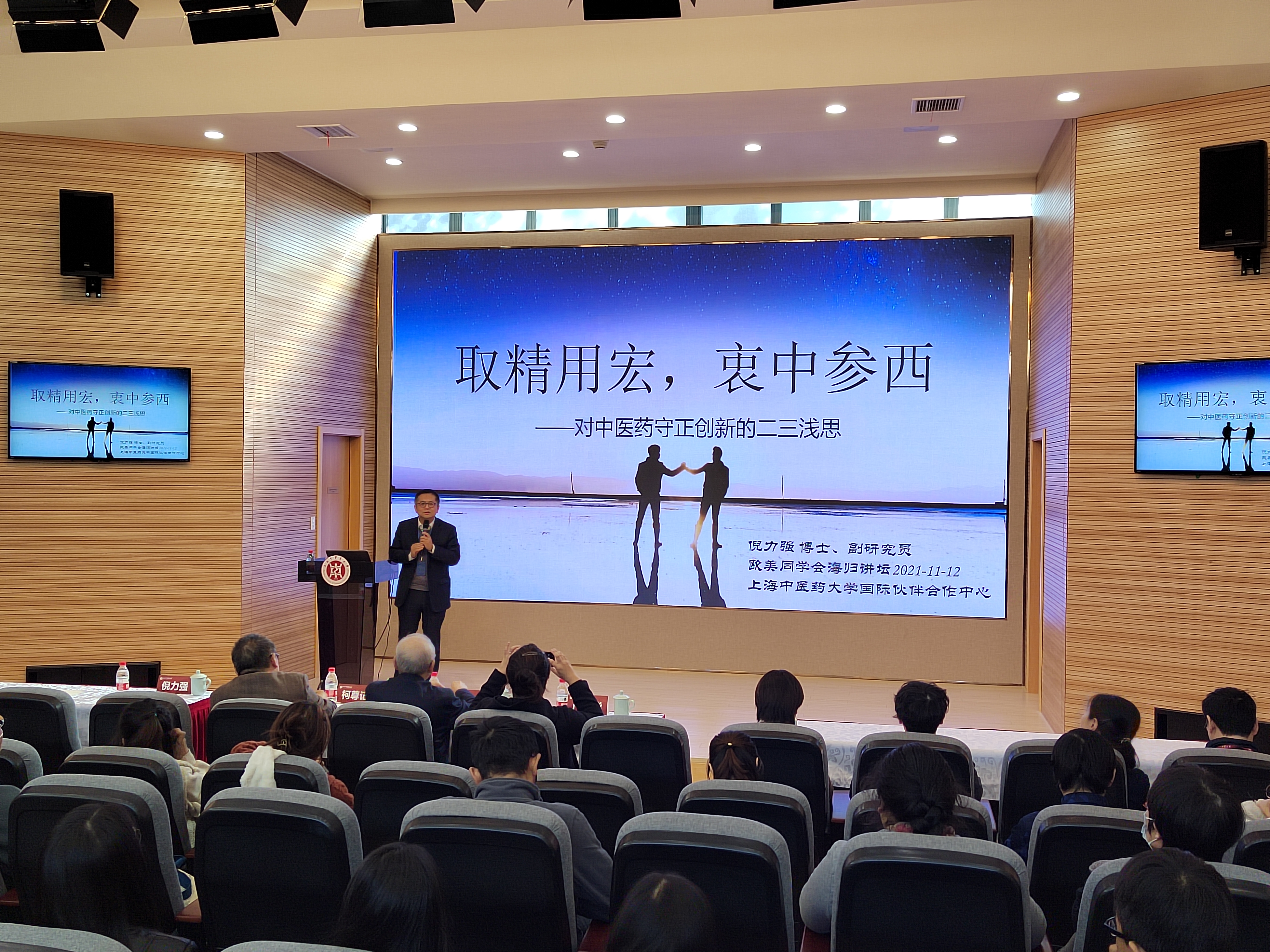 11月12日下午,由万象城官网统战部、欧美同学会、科技处、基础医学院联合主办的“海归讲堂”在全球合作伙伴中心一楼报告厅举办。校欧美同学会会长刘平、统战部副部长严月华出席。校欧美同学会副会长、基础医学院院长吕嵘主持讲堂。校图书馆常务副馆长、上海中医药杂志社社长倪力强,awc77万象城官网中西医结合研究院研究员柯尊记作讲座。