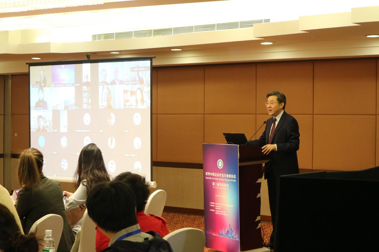 桑滨生在开幕式上讲话。他指出,音乐的疗愈作用古已有之。在没有硝烟的抗疫“心理战”中,音乐疗法专委会在王新华的带领下,在理事单位的共同努力下,推动音乐、医学、心理学等学科的交叉融合,聚焦音乐治疗学科的人才培养、科学研究和社会服务,为大众的心理健康做出了应有的贡献。对于音乐疗法专委会今后的发展,桑滨生寄予三点希望:一是加强中医音乐治疗学科建设,开展基础研究,构建中医音乐治疗理论与实践体系;二是在人才培养与专业建设上加大力气,借鉴国外音乐疗法技术和方法,突出中国特色;三是要加强组织建设,遵守总会的章程和相关规定,与总会秘书处保持密切沟通联系。
