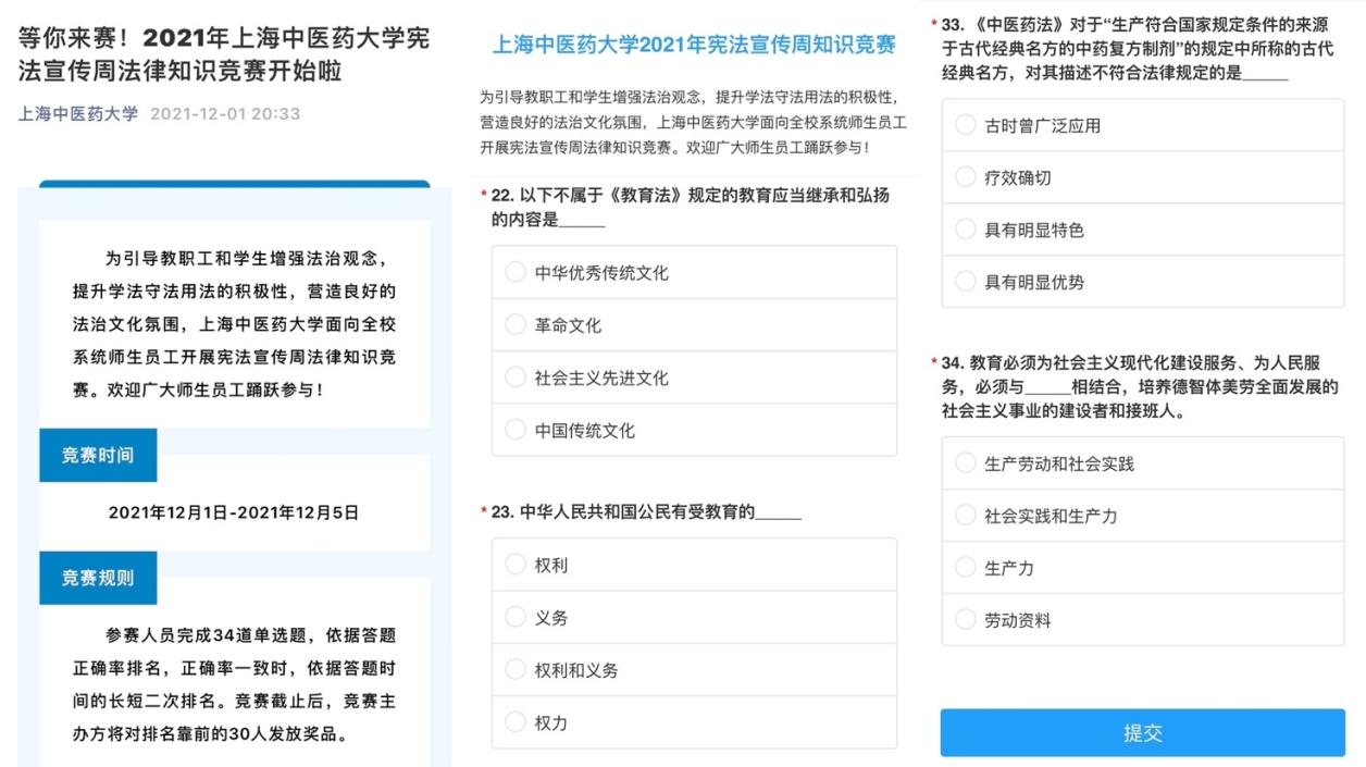 学校邀请马克思主义学院思想道德修养与法律基础教研室教师设计了宪法宣传周法律知识问答题目,并在学校官方微信平台上发布,内容涵盖宪法、民法典、教育法、中医药法,涉及我国的基本制度、公民的权利和义务、教育制度与规定、中药保护与发展等。知识竞赛一经发布就受到了师生踊跃的参与,增强了师生的法治观念,提升了学法守法用法的积极性。