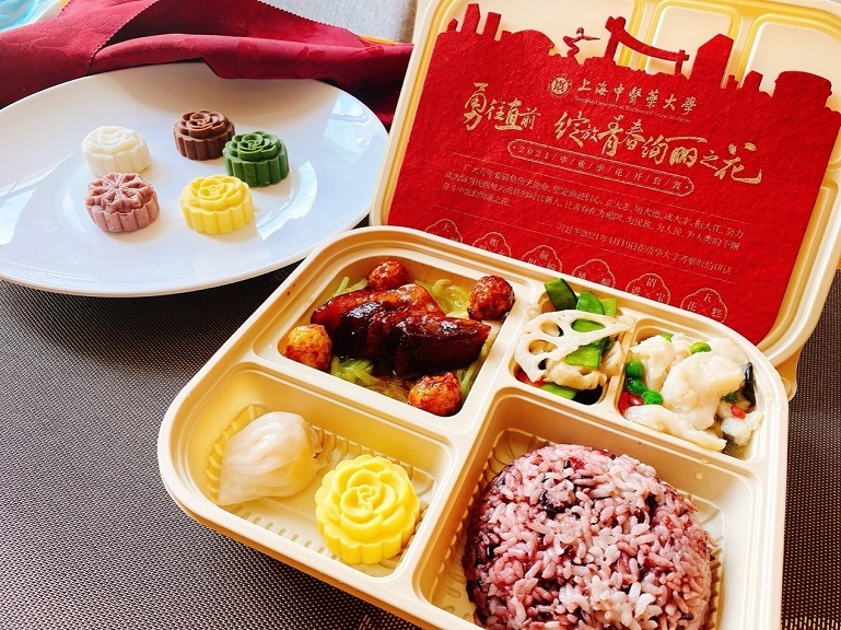 在毕业典礼当天,学生食堂为毕业生们精心准备“2021年毕业季花开套餐”,红色盒贴上写着“勇往直前,绽放青春绚丽花”,打开餐盒,精美别致的摆盘造型,色彩缤纷的食材组合,饱含寓意的菜品设计,让毕业生们眼前一亮。
