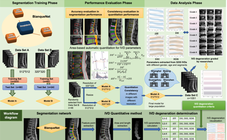 针对这一难题,该团队通过多学科交叉融合,率先开发出基于深度学习语义分割网络的椎间盘退变量化分析算法——BianqueNet。基于该算法极高的精准度,团队对全国4个城市共计1051例人群进行横断面研究,结果表明椎间盘内信号差异与椎间盘退变等级显著相关;再结合对不同人群基线特征(年龄、性别、椎间盘节段)构建不同椎间盘退变等级的参量标准,从而实现不同人群的精准化椎间盘退变自动量化评估,对椎间盘表观遗传学及经筋失衡研究具有很重要的指导价值。