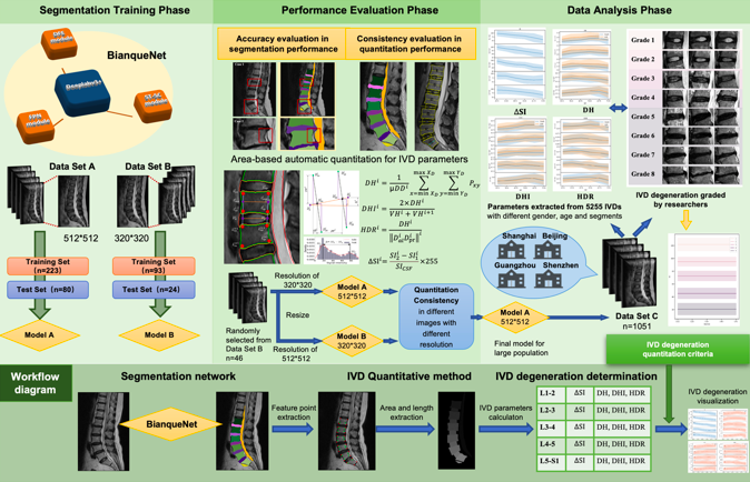 针对这一难题,该团队通过多学科交叉融合,率先开发出基于深度学习语义分割网络的椎间盘退变量化分析算法——BianqueNet。基于该算法极高的精准度,团队对全国4个城市共计1051例人群进行横断面研究,结果表明椎间盘内信号差异与椎间盘退变等级显著相关;再结合对不同人群基线特征(年龄、性别、椎间盘节段)构建不同椎间盘退变等级的参量标准,从而实现不同人群的精准化椎间盘退变自动量化评估,对椎间盘表观遗传学及经筋失衡研究具有很重要的指导价值。