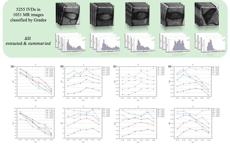 在算法展现出极高的可靠性基础上,项目组依托全国石筱山伤科联盟,分别在上中医附属龙华医院、北京中医药大学东直门医院、广东省中医院以及深圳平乐骨伤科医院,收集到共计1051份腰椎间盘MRI图像,采用该算法测得不同退变程度的椎间盘参数,并与人口统计信息,如年龄、性别、节段和退变等级等参数,进行相关分析。