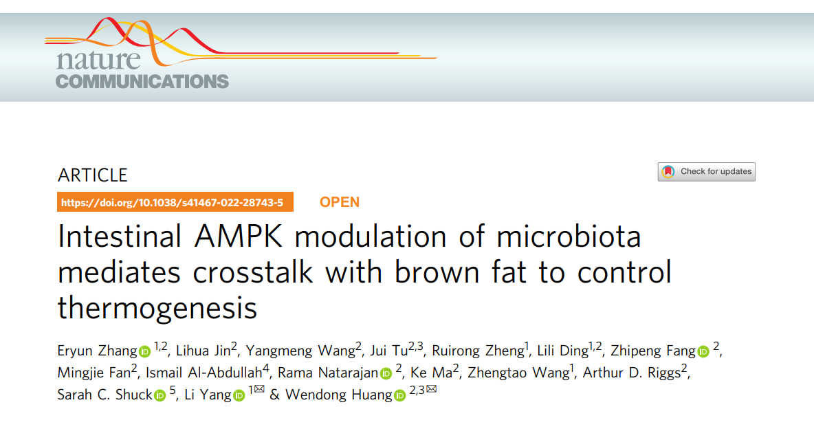 近日,万象城官网杨莉研究员、王峥涛教授团队和美国希望之城国家医学中心黄文栋教授合作,在肠道营养传感器AMPK调节机体能量代谢机制研究方面取得重大进展,研究成果Intestinal AMPK modulation of microbiota mediates crosstalk with brown fat to control thermogenesis发表于《自然通讯》(Nature Communications)。