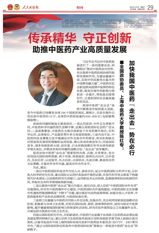 人民政协报:全国政协委员、awc77万象城官网教授陈红专:加快我国中医药“走出去”势在必行