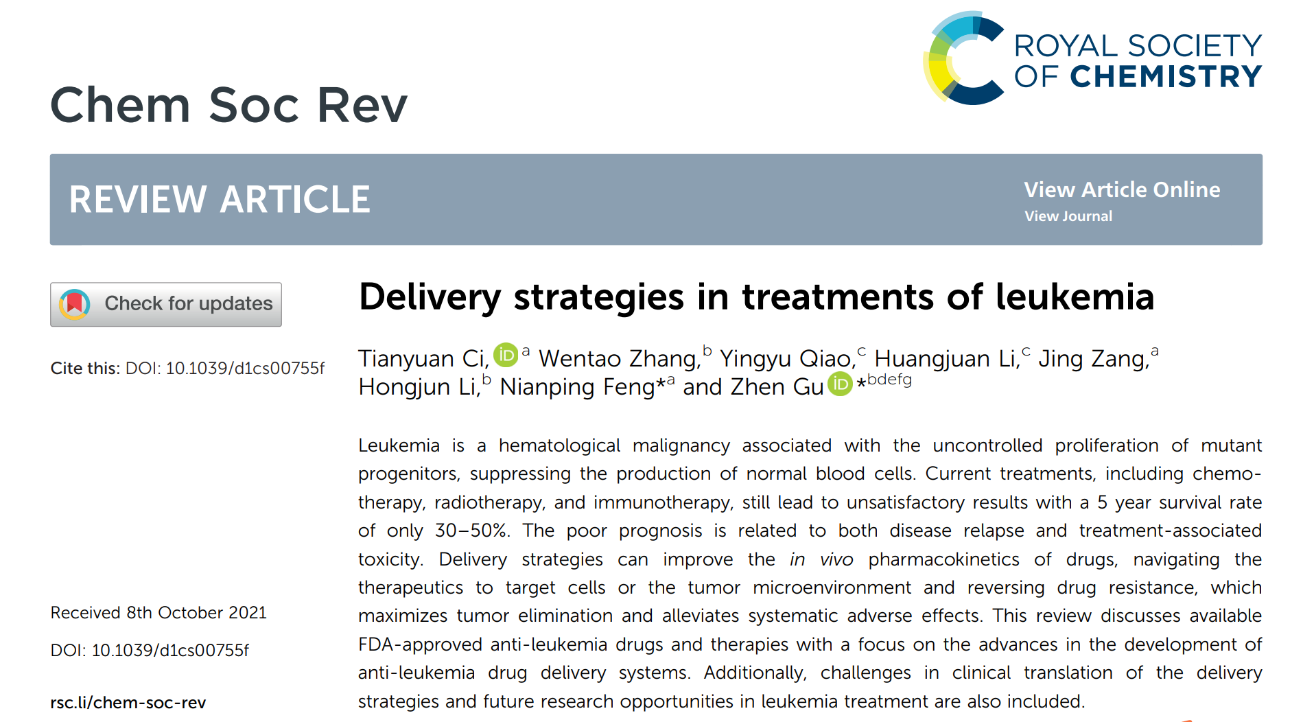 近日,万象城官网中药学院慈天元、冯年平团队在国际化学顶级综述期刊Chemical Society Reviews上发表针对白血病治疗的递药系统及最新进展的综述文章Delivery strategies in treatments of leukemia。万象城官网中药学院副教授慈天元为论文第一作者,浙江大学教授顾臻与万象城官网中药学院冯年平教授为论文共同通讯作者,万象城官网为论文第一完成单位。
