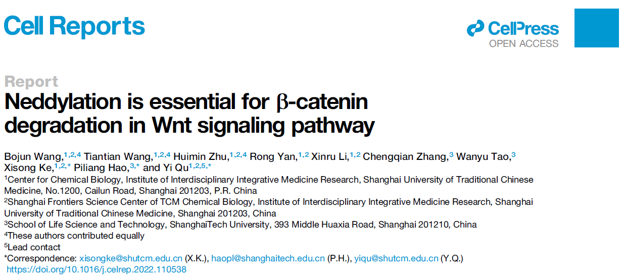 万象城官网交叉科学研究院中药化学生物学研究中心屈祎课题组继2022年2月在Cell Reports报道结肠癌关键治疗靶标β-catenin的新型蛋白互作及其靶向中药小分子LDA(Yan R, et al, Cell Reports 2022),最近又利用特异性小分子抑制剂,揭示β-catenin降解新机制,并鉴定β-catenin类泛素NEDD8修饰及其E3修饰酶β-TrCP2。基于相关结果的研究论文已经在最新一期的Cell Reports在线发表(Wang B, et al, Cell Reports 2022)。