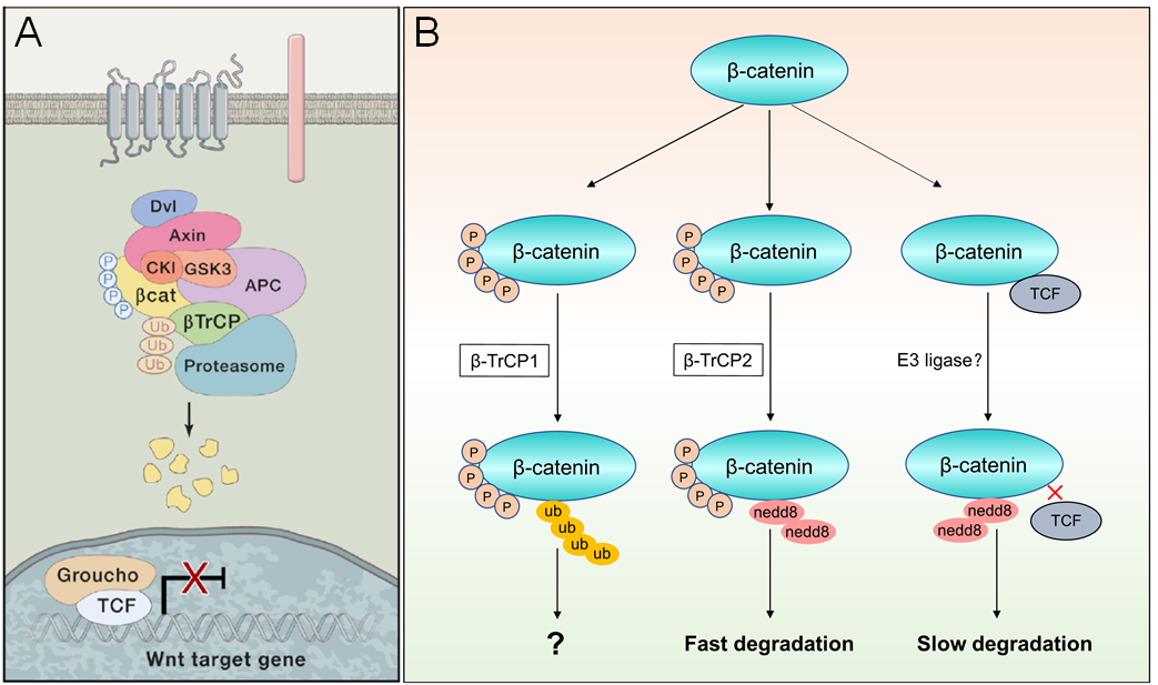 图1. β-catenin的翻译后修饰调控示意图。(A)在经典模型中,主要由泛素修饰介导β-catenin的降解(Nusse R and Clevers H, Cell. 2017);(B)本研究建立的修正模型中,NEDD8修饰不仅介导β-catenin的蛋白降解,还调控β-catenin与转录因子TCF4的蛋白互作(Wang B, et al, Cell Reports, 2022)。