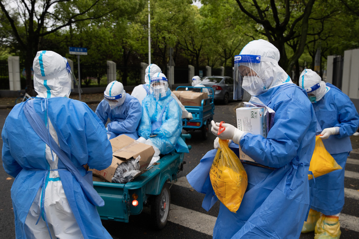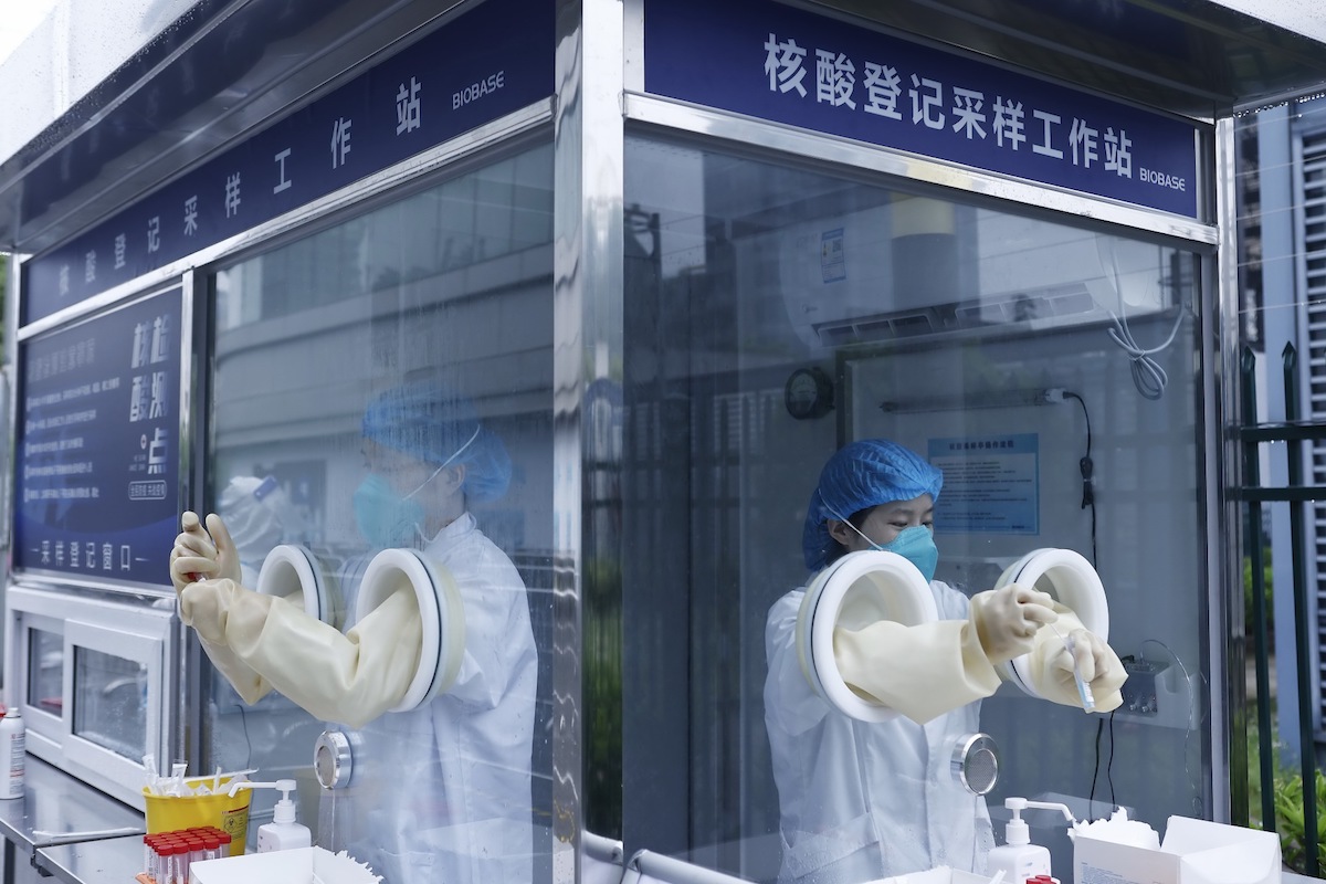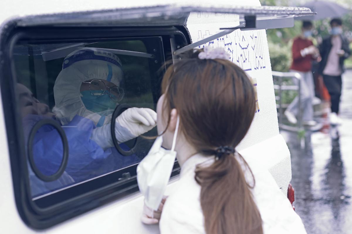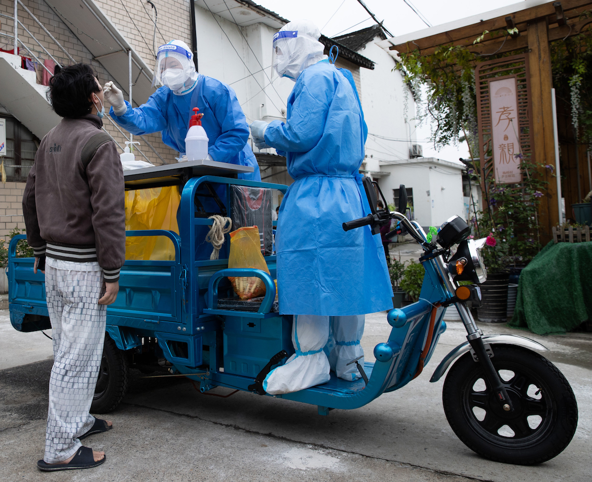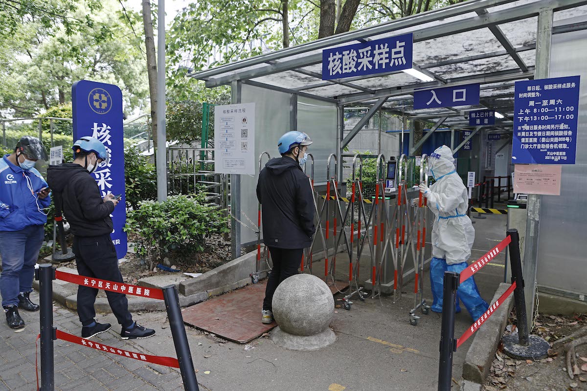 2022年4月27日,快递员在上海市长宁区云雾山路39号的天山中医医院核酸采样点进行核酸采样。