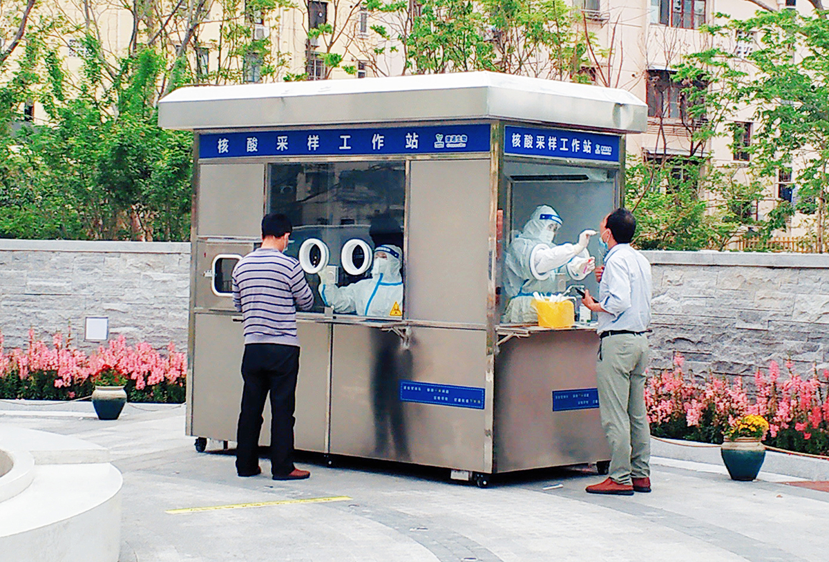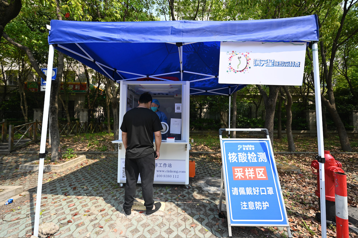 2022年4月24日,上海,天山路芙蓉江路口一座迷你核酸采样工作站,为不少流动快递员及保供人员提供了便利的核酸检测服务。