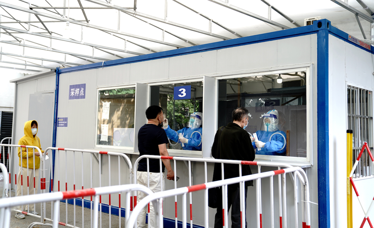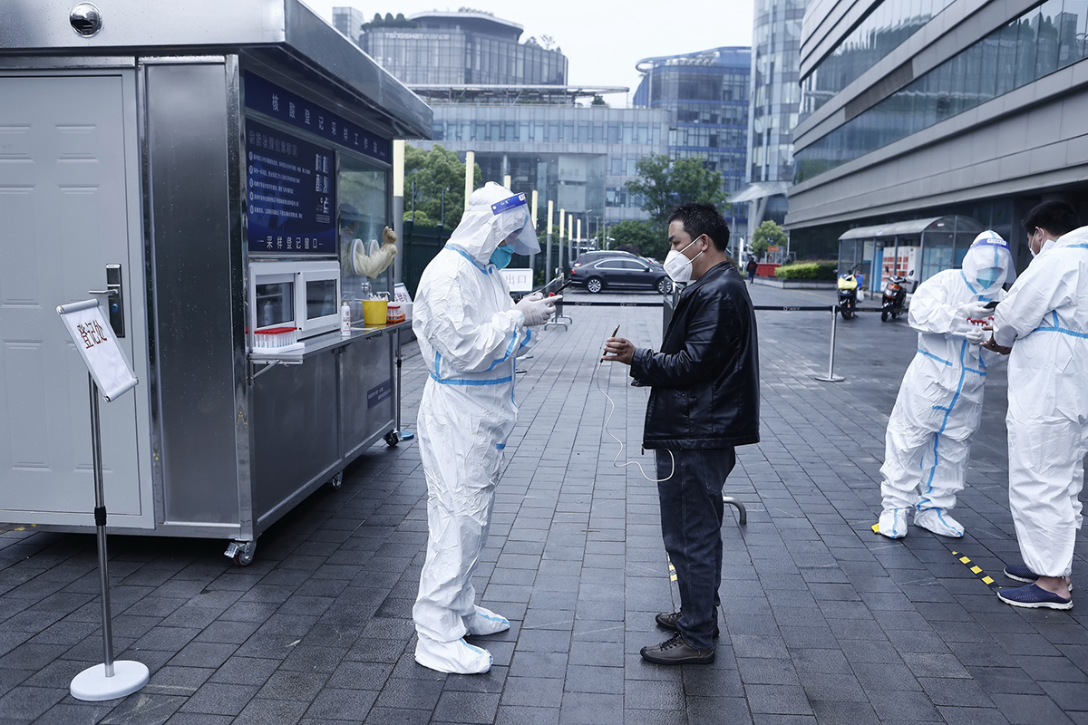 2022年4月27日,上海市闵行区中心医院核酸检测采样点。
