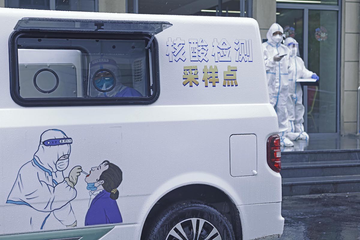 2022年4月26日,在上海市闵行区金都路,医护人员坐在核酸检测车内,等待民众前来进行核酸采样。