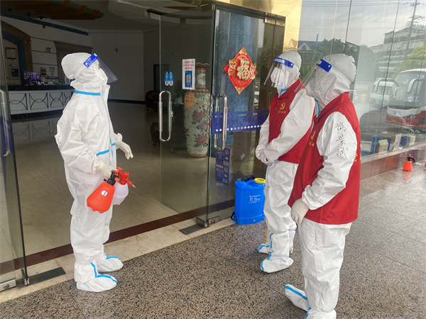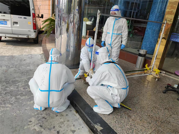 在前期沟通中,黄景斌老师了解到酒店硬件条件有限,团队成员大多没有医学背景。于是,黄老师结合自己的专业特长对隔离点进行风险排查,因地制宜地制备了一些防护措施,同时承担起核酸检测协助、转运发放物资等日常工作。同时,考虑到酒店门卫来自外聘保安公司,并非专业消杀人员,黄老师也承担了一部分常规消杀工作。