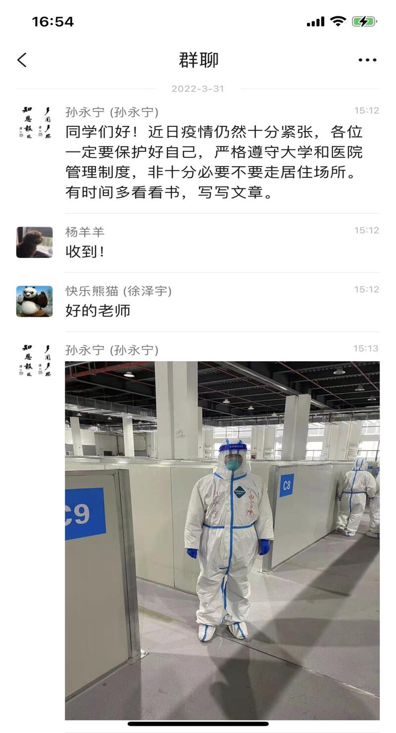 后来,有同学偶然给夏琪看了一张新闻截图,照片中正是穿着“大白”防护服的殷老师。只见照片下方标注着一行小字:“上海普陀跨采中心方舱医院院长 殷佩浩”。这时她才意识到,老师每次深夜关心的背后,藏着许多看不见的操劳与辛苦。 “在这场疫情中,诸多考验摆在大家面前,有些是物质层面,有些是心理层面,” 夏琪说:“不过有殷老师在我们面前做榜样,相信自己一定不会被这些简单的困难所打倒。” “各位一定要保护好自己,严格遵守大学和医院管理制度,非十分必要不要走出居住场所。有机会多看看书、写写文章。”“核酸时千万要注意!该排队时再排队,一家一堆,不要说话。检测时口罩往上推,不要露鼻孔,屏住呼吸,尽量闭眼……”中医大市中医临床医学院副院长孙永宁,也第一时间以领队身份带领市中医医院医疗团队进驻崇明区长兴岛方舱医院,在夜以继日的忙碌中仍心系学生学习和生活。