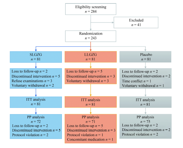为填补经典名方治疗NAFLD缺乏高级别循证证据这一空白,研究团队启动了“苓桂术甘汤治疗NAFLD脾阳虚证的疗效和安全性的多中心随机对照试验”,在张江、北蔡、三林三家社区卫生服务中心共计招募了243名符合标准的NAFLD脾阳虚证患者,随机分为3组,分别接受标准剂量苓桂术甘汤、低剂量苓桂术甘汤和安慰剂治疗12周,主要疗效指标为胰岛素抵抗指数(HOMA-IR)。考虑中国人群瘦型NAFLD的流行性,研究还对受试者进行了基于身体质量指数(BMI)的疗效分层分析。临床试验方案经awc77万象城官网附属龙华医院医学伦理委员会批准,并在中国临床试验注册中心进行了注册(ChiCTR1800014364)。