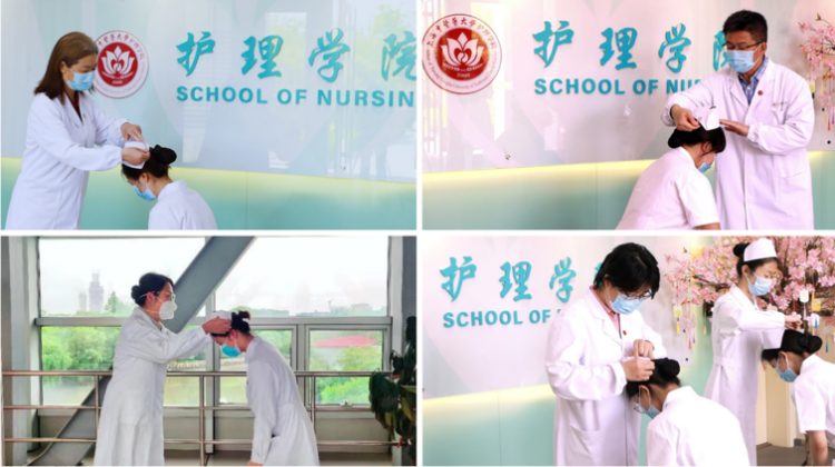 上中医校领导、职能部门负责人和护理学院教师代表一起,分别在校园里和学校附属曙光医院东院,为护生代表授帽。他们把寓意传承与责任的白色燕尾帽,庄严郑重地授予即将步入临床学习的护理学子。“戴上燕尾帽,我要肩负起上中医赋予护理学子的使命与责任!” 2019级护理本科学生党员木夏热普·塔来提畅想即将到来的新征程,表示将以青春之力量,勇担上中医护理人的使命与荣光。