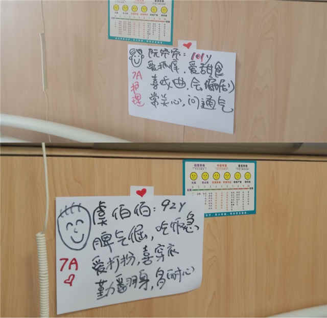 阚奶奶:90岁,爱说话、念孙子、眼睛花、走路摇;阮爷爷:101岁,爱抓痒、爱甜食、常关心、问通气……这些“个性化床贴”出自护士张俊颖之手,原本是为了帮助交班和查房的同事更好地了解患者,没想到意外在病房走俏,“老宝贝”们“争宠”着要求给自己床头也来一个“小贴士”。