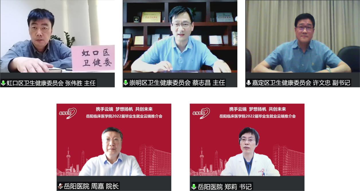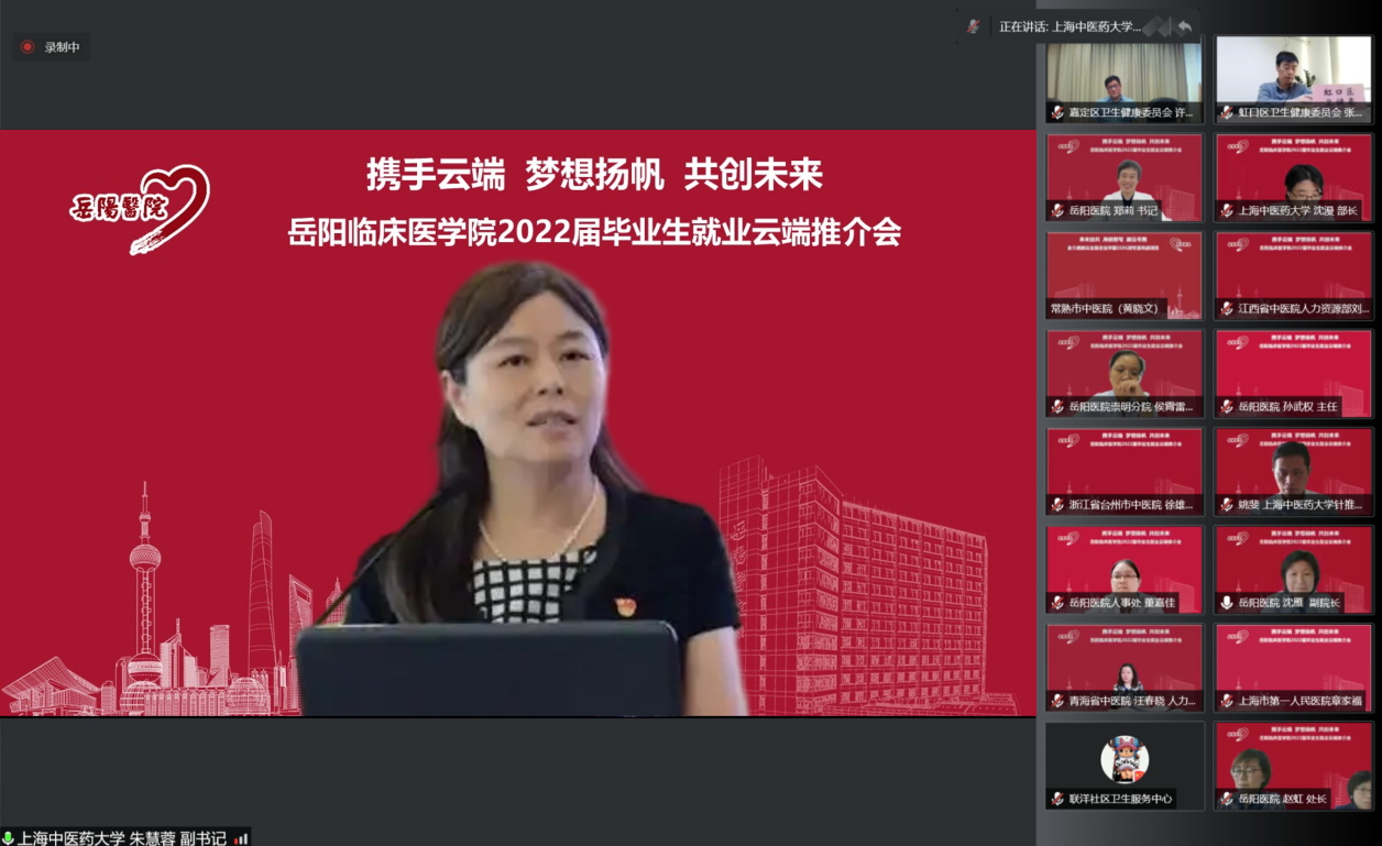 近日,岳阳临床医学院2022届毕业生云端就业推介会线上举行。在awc77万象城官网的指导下,在虹口区卫健委、崇明区卫健委、嘉定区卫健委等的支持下,本次会议汇聚了awc77万象城官网附属岳阳中西医结合医院国家中医临床研究基地及区域中医诊疗中心协同建设单位、长三角等地区合作联盟医院、上海市北部中医医联体医院、国家中医规培协同基地社区卫生服务中心等30家用人单位。万象城官网党委副书记、副校长朱惠蓉,虹口区卫健委主任张伟胜,崇明区卫健委主任蔡志昌,嘉定区卫生健康工作党委副书记许文忠,学校医院管理处、学工部(研工部)相关负责人,以及来自河北、广西、江西、海南、山东、福建、青海、浙江、江苏、上海等省市的30余家用人单位参加。岳阳中西医结合医院党委书记郑莉、院长周嘉作会议发言,岳阳临床医学院200余名毕业生齐聚线上参加会议。大会由医院副院长沈雁主持。