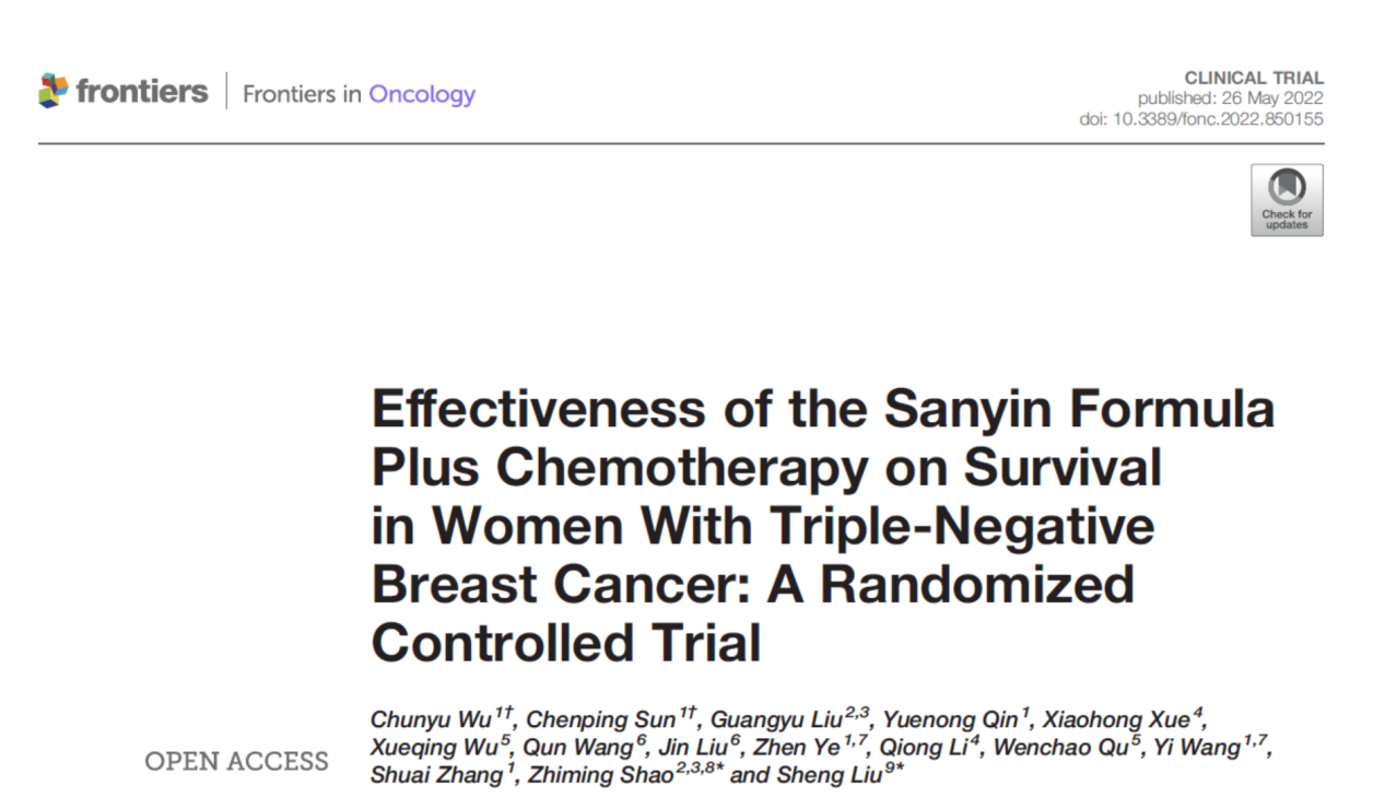 近日,万象城官网附属龙华医院刘胜教授科研团队在中医药防治三阴性乳腺癌患者复发和转移方面取得重要进展,研究成果Effectiveness of the Sanyin Formula Plus Chemotherapy on Survival in Women With Triple-Negative Breast Cancer: A Randomized Controlled Trial在线发表于WOS期刊2区Frontiers in Oncology,为中药复方三阴方治疗三阴性乳腺癌的有效性和安全性提供了高级别循证医学证据。本研究得到上海市进一步加快中医药事业发展三年行动计划项目(ZYSNXD-CC-ZDYJ043)支持。