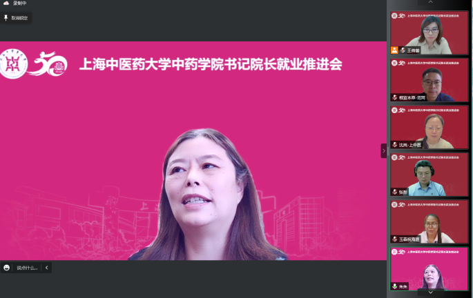 为深入贯彻落实党中央、国务院关于高校毕业生就业工作的决策部署,扎实推进促就业行动,深化校企合作和供需对接,助推毕业生高质量就业,助力2019级学生做好就业准备,6月24日,中药学院以“职面未来 就业同行”为主题举办书记院长就业推进会。校党委副书记、副校长朱惠蓉,学工部(研工部)部长沈漫、副部长张瑛,苏州玉森新药开发有限公司副总经理祝海涯、研发质控总监郭静,上海相宜本草化妆品股份有限公司首席人力资源官范珂、雇主品牌与项目管理徐雪莹,中药学院党委书记沈岚、院长张彤、副院长郑昌武及中药学院学生工作队伍、2022届毕业生及2019级学生参会。会议由中药学院党委副书记王倩蕾主持。