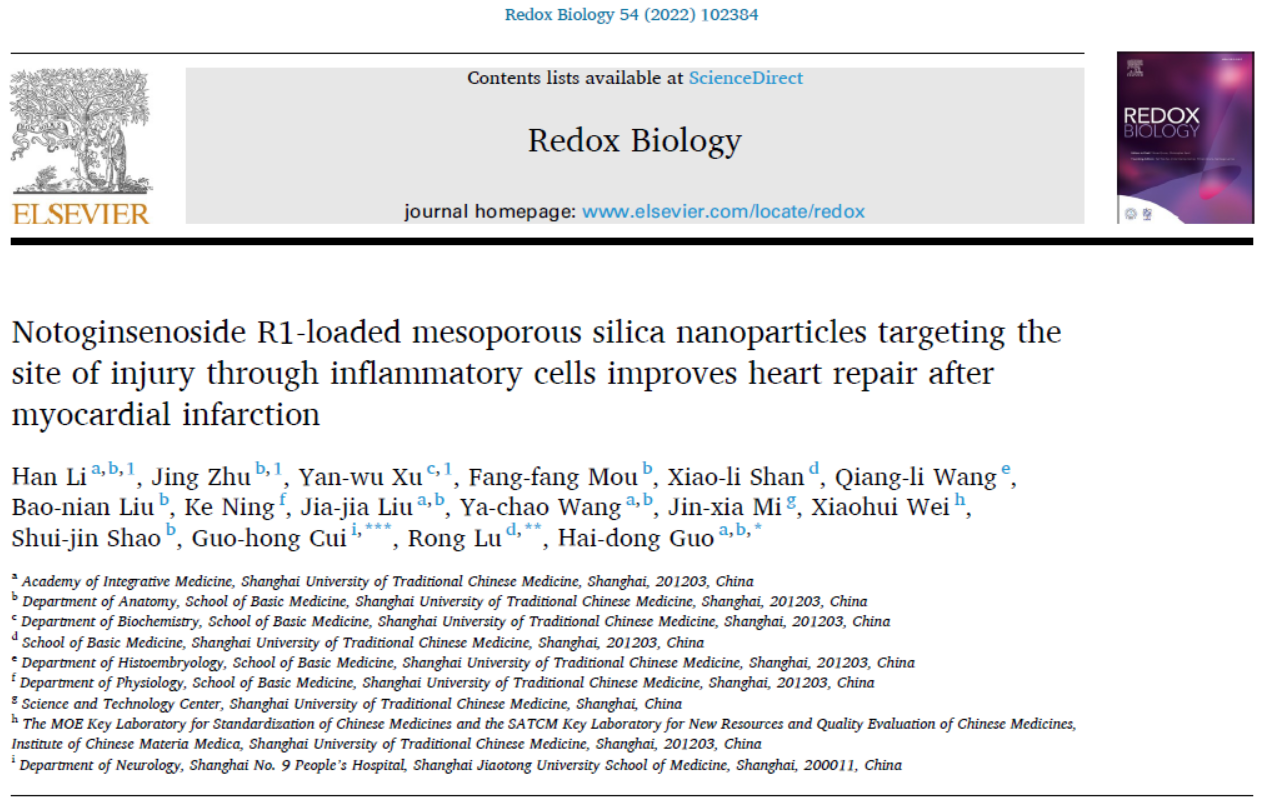近日,万象城官网中西医结合研究院国海东研究员和基础医学院吕嵘教授团队在三七皂苷R1(NGR1)靶向治疗心肌缺血损伤的作用及机制上取得重要进展,研究成果Notoginsenoside R1-loaded mesoporous silica nanoparticles targeting the site of injury through inflammatory cells improves heart repair after myocardial infarction发表于Redox Biology杂志。