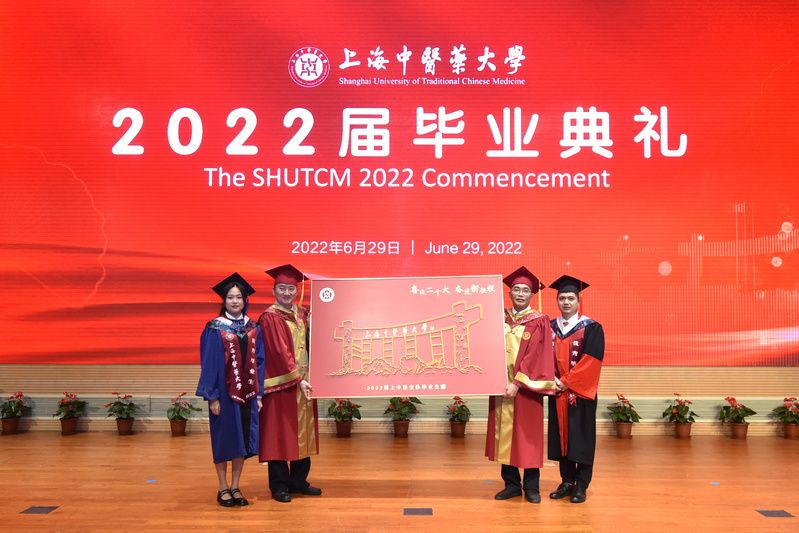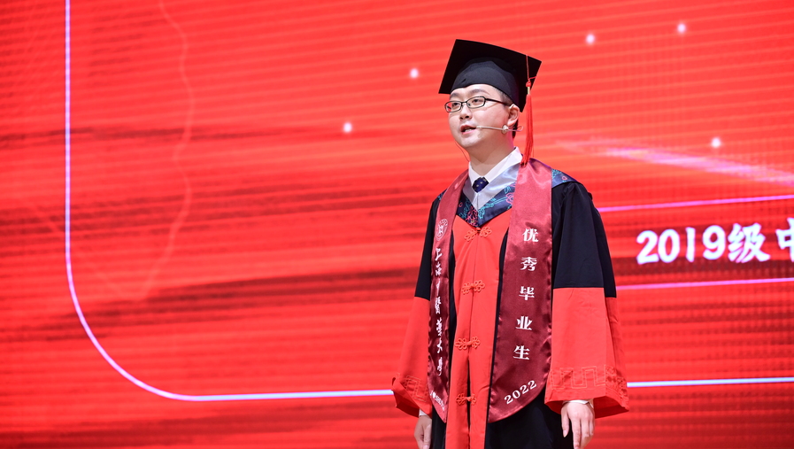 “阳光洒遍青翠的杏林,我们相聚在浦江之滨,努力弘扬中华的瑰宝,为人类托起浓浓的绿荫……”校歌声中,awc77万象城官网2022届毕业典礼今天(29日)送别1956名本专科生、研究生。他们中,来自创新中药研究院的博士研究生俞少鹏,走上图书馆报告厅主会场的讲台向师友临别赠言。