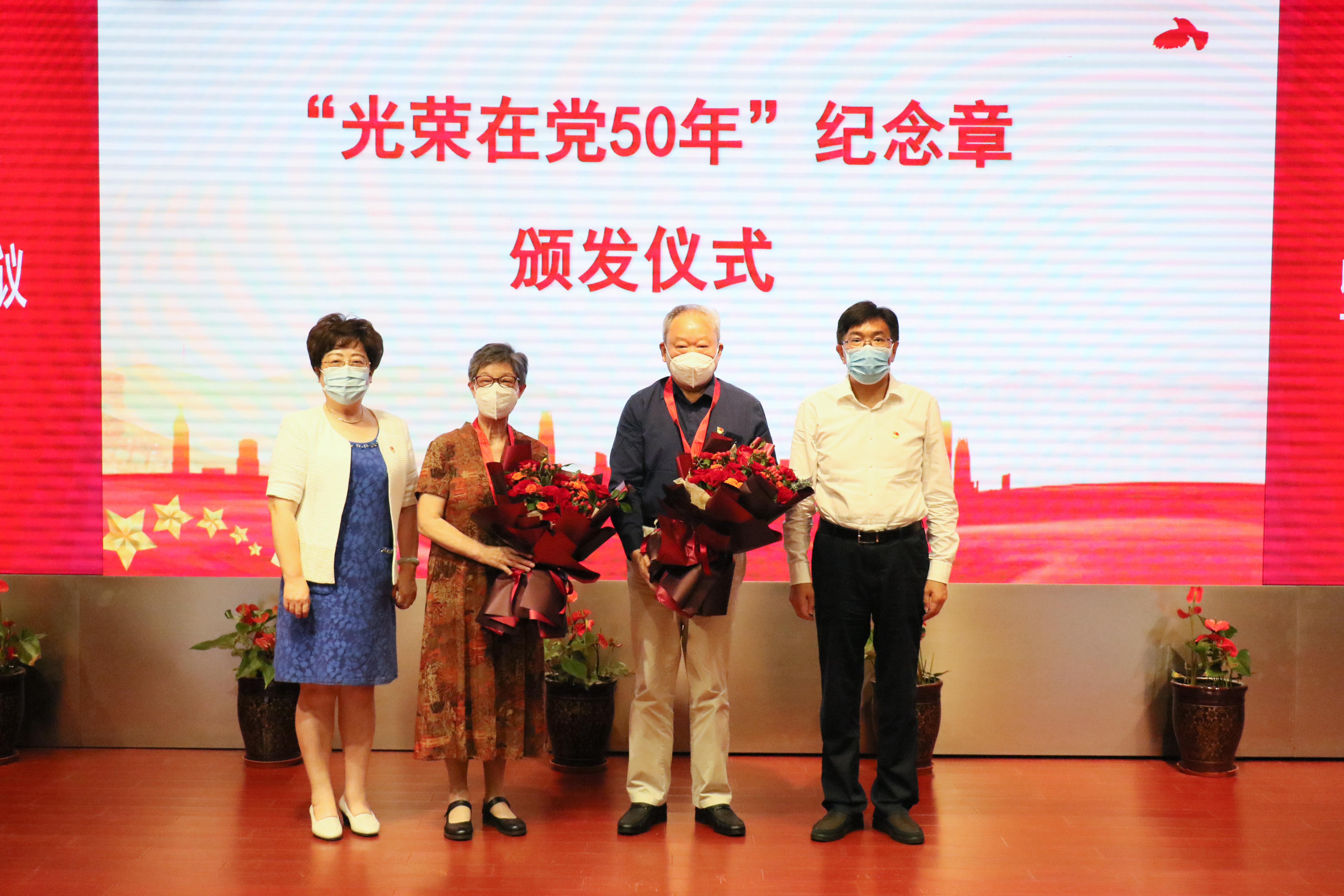 会议首先举行“光荣在党50年”纪念章颁发仪式。房敏宣读“光荣在党50年”名单,曹锡康和曙光医院党委书记马俊坚共同为党员代表张如明同志、钱黎清同志颁发纪念章。