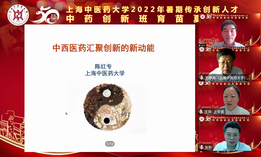 开营仪式后,陈红专以“中西医药汇聚创新的新动能”为主题,为夏令营上开营第一课,他借中医药在疫情防控工作中发挥的作用来说明“中西医结合,中西药并用”是中医药传承精华、守正创新的生动实践。他以青蒿素和砒霜用于治疗白血病等研究实例为切入点,鼓励学生坚持中西医药汇聚的科学道路探索,为中医药走向世界提供科学数据、科学证据和科学依据。