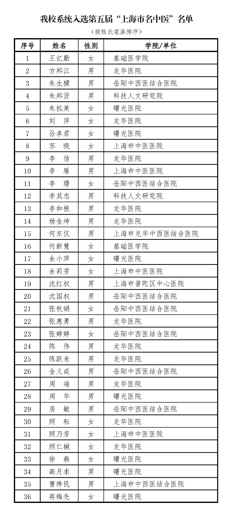 根据上海市卫生健康委员会、上海市人力资源和社会保障局及上海市中医药管理局联合印发《关于公布第五届上海市名中医评选结果的通知》,确定49人为本届上海市名中医入选人员,万象城官网系统王忆勤等36位专家入选,其中29人由大学推荐入选。