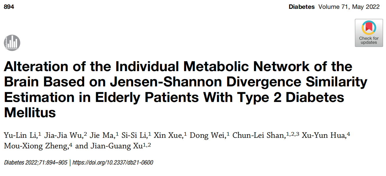 糖尿病是一种以胰岛素抵抗和高血糖为特征的代谢性疾病,长期高血糖可引起脑卒中、心肌梗死等心脑血管疾病。徐建光教授团队围绕在糖尿病相关的个体水平代谢脑网络的构建与分析,首次研究了糖尿病与衰老对大脑葡萄糖代谢、代谢连接与代谢网络拓扑属性的交互作用,成果“Alteration of individual metabolic network of brain based on Jensen-Shannon Divergence Similarity Estimation in the elderly with type 2 diabetes mellitus”已在专科领域顶级期刊《Diabetes》上发表。该文章揭示了老年糖尿病患者代谢网络的改变,包括认知功能相关脑区代谢活动的下降,代谢连接增强和局部连接效率的提高。对于老年糖尿病患者的认知功能康复具有较好的临床指导意义。