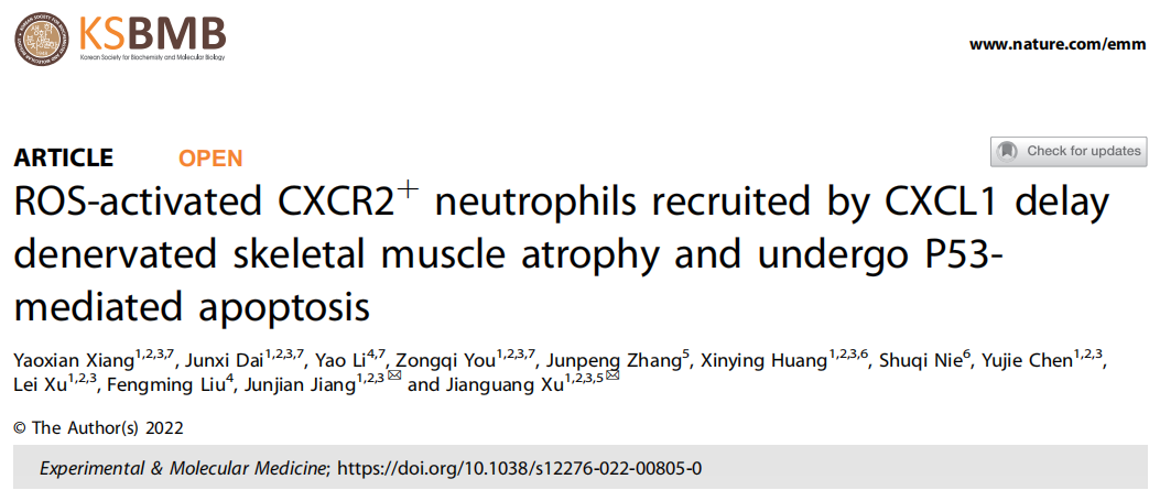 在神经损伤疾病的外周机制方面,周围神经损伤后再生神经轴突生长缓慢,中性粒细胞介导的固有免疫反应可能在恢复过程中发挥作用。徐建光教授团队在专科领域顶级期刊《Experimental & Molecular Medicine》发表文章“ROS-activated CXCR2+ neutrophils recruited by CXCL1 delay denervated skeletal muscle atrophy and undergo P53-mediated apoptosis”,为中性粒细胞减缓失神经肌肉萎缩过程提供证据。
