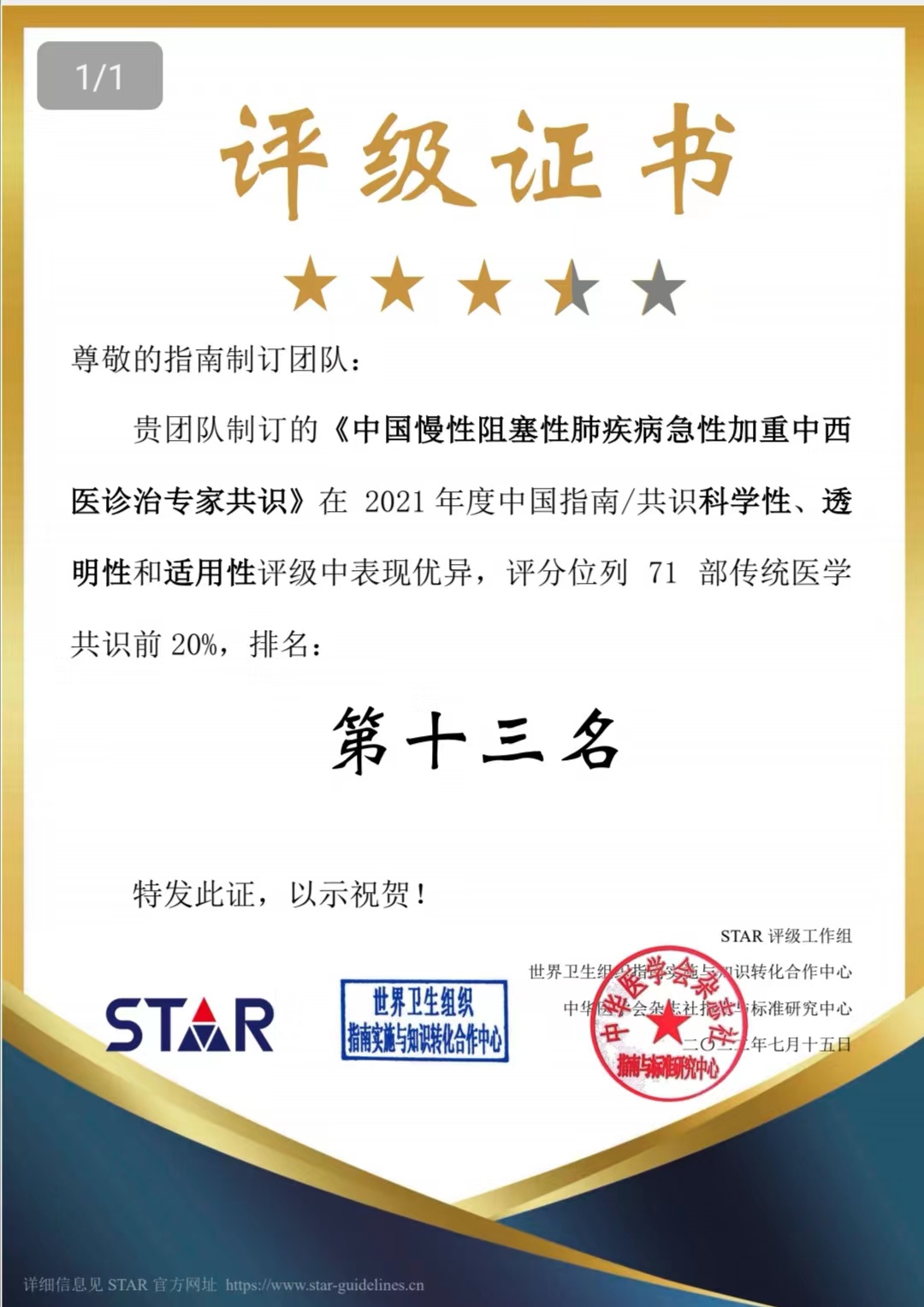 附属龙华医院方邦江教授牵头制定《中国慢性阻塞性肺疾病急性加重中西医诊治专家共识(2021)》在中国指南/共识评级中成绩优异