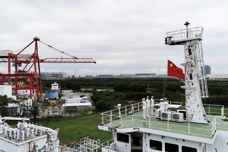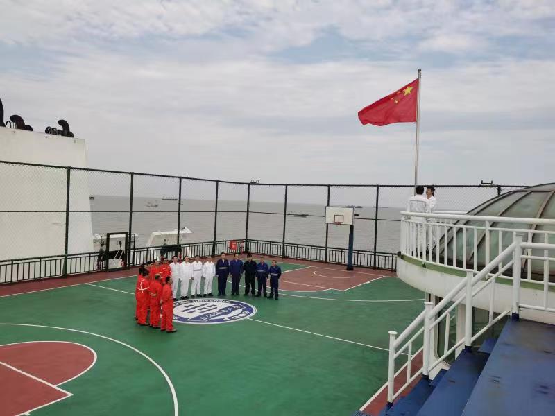 在上海海事大学“吴淞号”教学船上,五星红旗冉冉升起。
