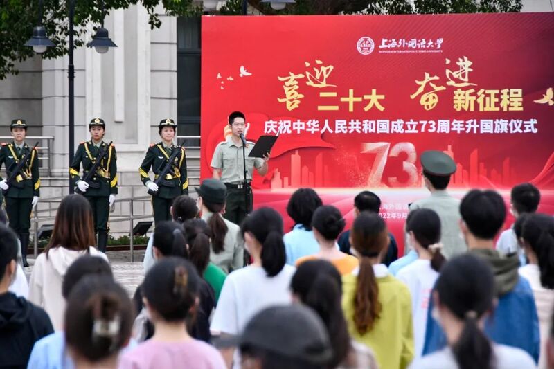 随后,现场全体师生一起唱响《我和我的祖国》,现场气氛被推向最高点。“2019年国庆,我作为国旗护卫队的一员参加了升旗仪式;2022年国庆,我已是一名退伍老兵,再次看着国旗冉冉升起,内心无比激动。”俄罗斯东欧中亚学院2022年退役研究生江宇红说。“作为一名预备党员,我郑重地宣读了入党誓词。注视着那面鲜红的党旗,抚摸着胸口那闪亮的党徽,心中的钦佩之情不禁油然而生。今后,我将以党员标准严格要求自己,全心全意为人民服务。”东方语学院19级阿拉伯语系学生王荧翔说。