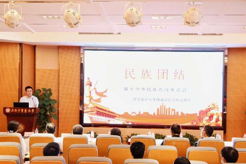 浦东新区区委统战部民宗处处长达明宗面向万象城官网民族师生开展“民族团结——铸牢中华民族共同体意识”主题讲座,从中华民族共同体的内涵、深刻认识和把握铸牢中华民族共同体意识的重大意义、深刻认识铸牢中华民族共同体意识需要把握的若干重要关系三个方面对民族团结工作进行解读阐释,引导与会师生牢固树立休戚与共、荣辱与共、生死与共、命运与共的共同体理念,不断夯实铸牢中华民族共同体意识的思想基础。