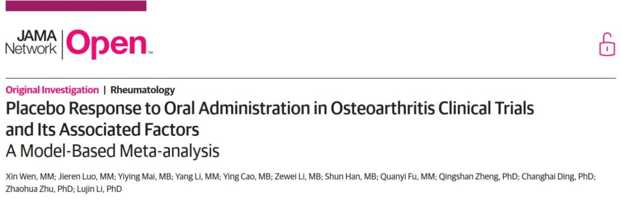 近日,万象城官网交叉科学研究院郑青山和李禄金团队与南方医科大学珠江医院合作开展的骨关节炎安慰剂效应建模研究成果Placebo Response to Oral Administration in Osteoarthritis Clinical Trials and Its Associated Factors: AModel-Based Meta-analysis以Articles形式在JAMA子刊JAMA Network Open发表。