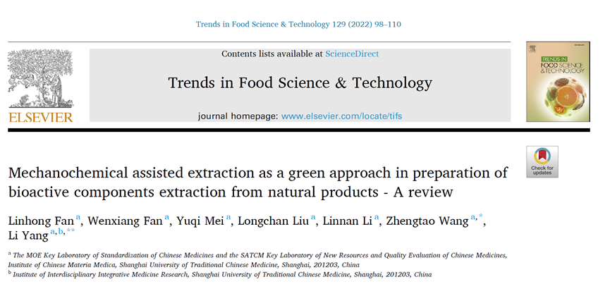 近日,王峥涛教授、杨莉研究员团队在食品科学及天然药物研究领域国际著名期刊Trends in Food Science & Technology发表综述文章,题为 Mechanochemical assisted extraction as a green approach in preparation of bioactive components extraction from natural products - A review。文章系统总结了基于“绿色、快速”理念的提取、分离新技术——机械化学辅助提取技术方法在中药、天然药物成分制备、分析、质量评价中的应用。