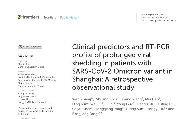 在感染新冠病毒奥密克戎变异株患者中发现有相当部分核酸清除时间延长,这增加了疾病控制的复杂性并引起广泛关注。方邦江教授团队对新冠病毒奥密克戎变异株感染患者临床特征进行大样本临床研究,研究成果发表于知名国际公共卫生期刊Frontier Health Public。
