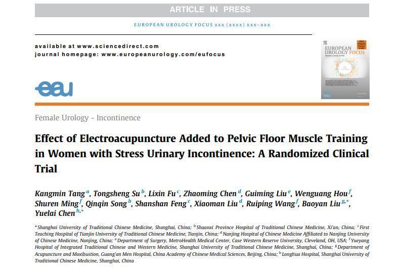 近日,附属龙华医院陈跃来教授团队进行的电针综合治疗压力性尿失禁临床评价再获新进展。该针灸临床研究项目电针结合盆底肌训练治疗压力性尿失禁随机对照试验的研究成果Effect of Electroacupuncture Added to Pelvic Floor Muscle Training in Women with Stress Urinary Incontinence: A Randomized Clinical Trial在泌尿外科领域权威杂志European Urology杂志子刊European Urology Focus上发表。
