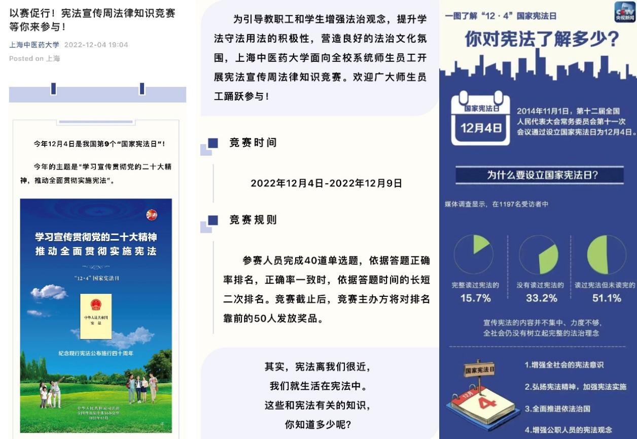 学校邀请马克思主义学院思想道德修养与法律基础教研室教师设计了宪法宣传周法律知识问答题目,内容涵盖宪法、民法典、教育法、中医药法等,涉及我国的基本制度、公民的权利和义务、教育制度与规定、中药保护与发展等法律常识。国家宪法日当天,知识竞答在学校官方微信平台上发布,师生踊跃参与,以赛促行,提升师生学法守法用法的积极性和普法教育的趣味性。截止12月9日共收到400份有效答卷。