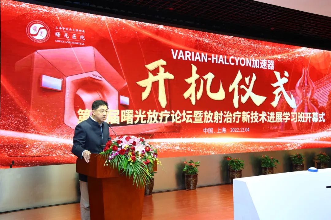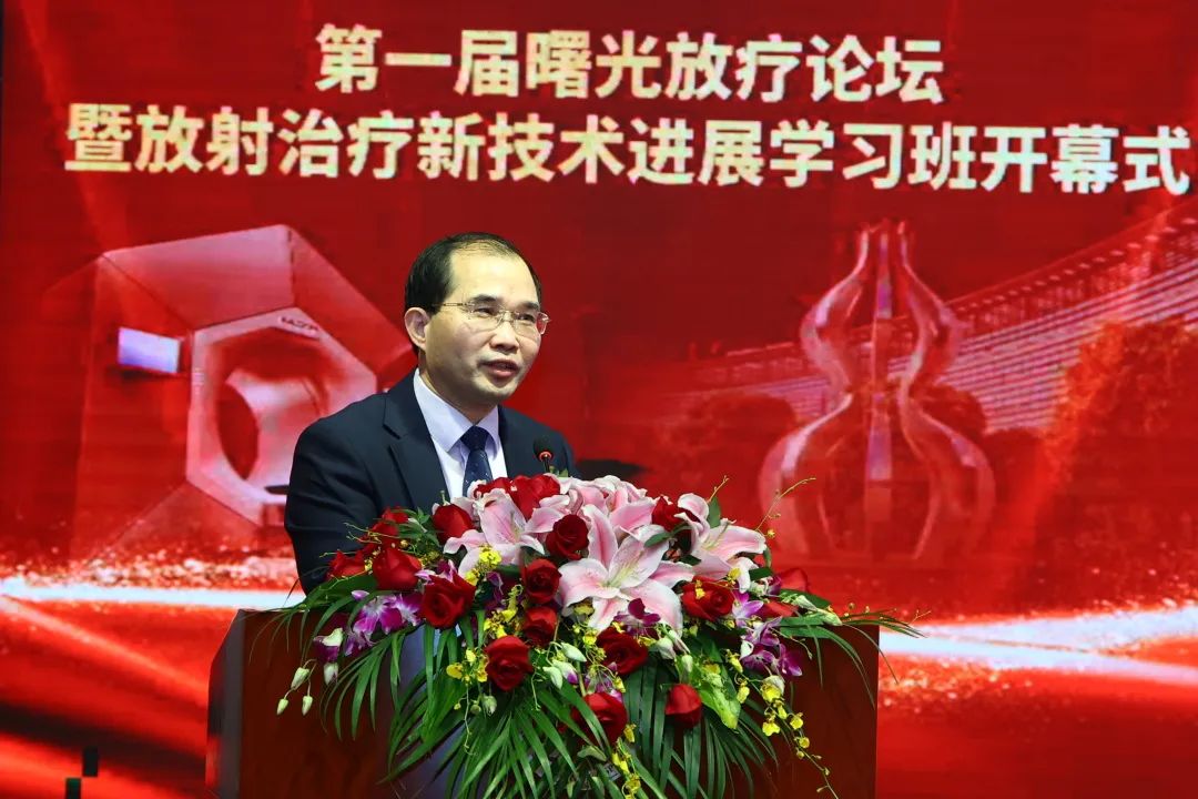 医院党委副书记、院长房敏致欢迎辞。他提到,经过两年的筹建,曙光医院放疗科克服重重困难顺利开科,是医院秉承“大医德泽,生命曙光”,致力于“中西合璧、精中通西”的新医疗模式下的实践成果。他相信曙光医院放疗科将团结奋进,用精湛的医术服务于病患,开启新的征程。
