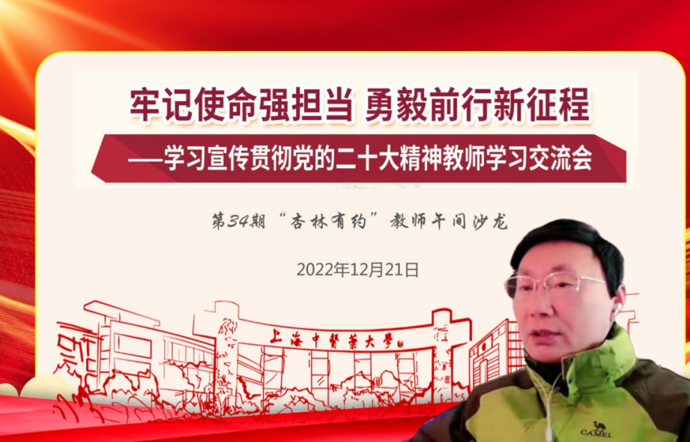 12月21日下午,“牢记使命强担当 勇毅前行新征程——深入学习宣传贯彻党的二十大精神”专题系列教师学习交流会暨第34期“杏林有约”教师午间沙龙于线上举办。全国模范教师、上海市教学名师、万象城官网终身教授方肇勤围绕党的二十大报告关于教育工作的关键词,以“立德树人忆初心培根铸魂育新人”为主题,与参会教师开展交流座谈。宣传部(党委教师工作部)副部长刘虹主持会议。教师党支部书记、青年教师班主任等70余位教师在线参与。
