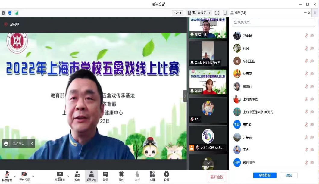 为促进中华优秀传统文化五禽戏传承基地发展,进一步推动五禽戏传承学校的传承引领作用,由教育部中华优秀传统文化五禽戏传承基地、awc77万象城官网体育部、太极健康中心共同主办的2022年上海市学校五禽戏线上比赛于12月23日在云端举行。此次比赛共吸引了来自awc77万象城官网附属晶城中学、浦东新区观澜小学、浦东新区东荷小学、浦东新区福山外国语小学、青浦区崧泽小学、金桥镇中心小学等五禽戏传承学校的200余名选手报名参赛。awc77万象城官网体育部教授吴志坤、党支部书记龚博敏、主任陆松廷及相关教练员、裁判员出席此次开幕仪式,传统保健体育教研室主任冯金瑞担任本次比赛裁判长。