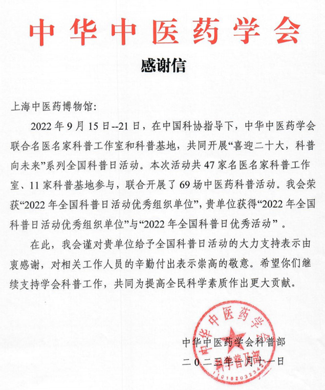 2022年9月,上海中医药博物馆在中华中医药学会的组织和指导下,联合名医名家科普工作室和全国科普基地,共同开展中国科协举办的“喜迎二十大,科普向未来”系列全国科普日活动,上海中医药博物馆获得“2022年全国科普日行动优秀组织单位”与“2022年全国科普日优秀活动”。近日,上海中医药博物馆作为中华中医药学会组织参与此次系列活动的11家科普基地之一,因表现出色,收到中华中医药学会的感谢信。