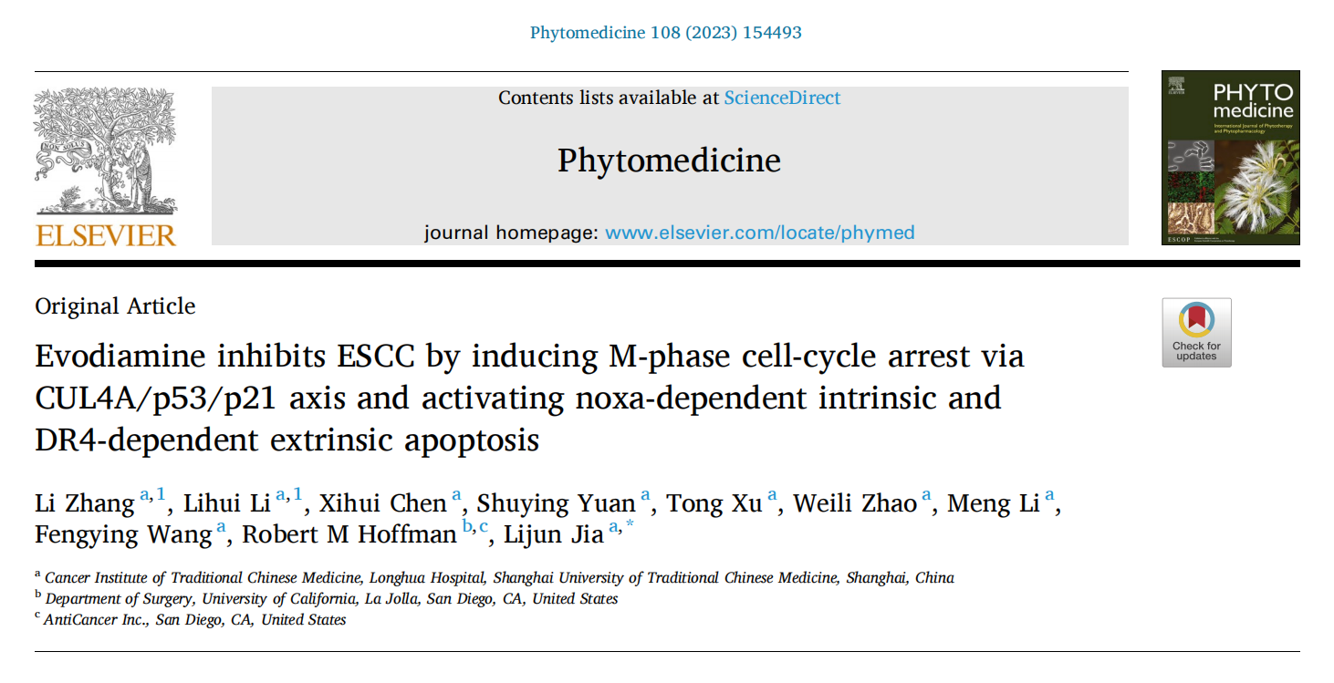 awc77万象城官网附属龙华医院、上海市中医药研究院中医肿瘤研究所贾立军教授团队选取中药吴茱萸中主要活性成分——吴茱萸碱(Evodiamine,Evo),针对其抗食管癌效果及相关的分子调控机制,开展了深入研究。近期,团队以研究论文形式在国际权威期刊Phytomedicine上发表了最新研究成果Evodiamine inhibits ESCC by inducing M-phase cell-cycle arrest via CUL4A/p53/p21 axis and activating noxa-dependent intrinsic and DR4-dependent extrinsic apoptosis。