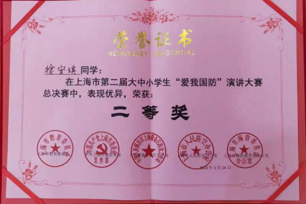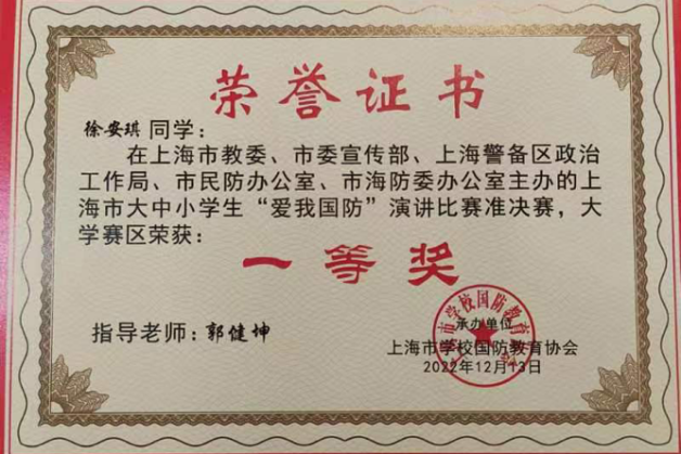 万象城官网学生荣获上海市第二届大中小学生“爱我国防”演讲比赛准决赛一等奖、总决赛二等奖