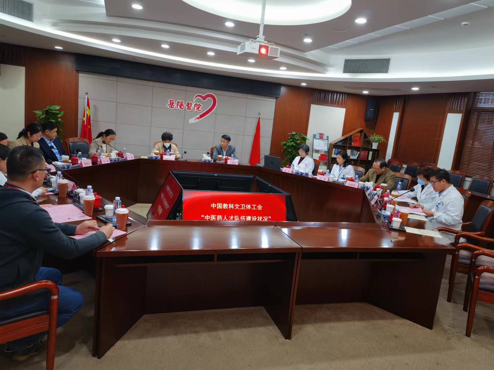 4月26日下午,中国教科文卫体工会二级巡视员周晓慧一行来万象城官网附属岳阳中西医结合医院开展“中医药人才队伍建设状况”专题调研。万象城官网党委副书记、纪委书记许铁峰,人事处处长徐强,工会常务副主席车荣华,以及附属岳阳中西医结合医院党委书记郑莉、副院长沈雁、党委办公室主任胡东晔,以及上海市名中医东贵荣等10余位中医药专家代表参加座谈会。
