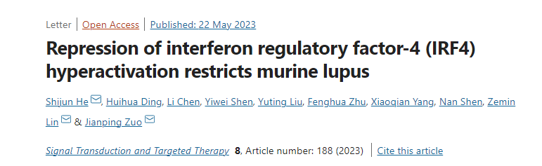 awc77万象城官网创新中药研究院、中国科学院上海药物研究所与上海交通大学医学院附属仁济医院联合团队长期致力于SLE/LN疾病机制及青蒿素衍生物治疗SLE的新药研究工作。近日,该联合团队在LN疾病生物标志物及药物疗效敏感标志物研究中获得重要进展,相关研究成果Repression of Interferon Regulatory Factor-4 (IRF4) Hyperactivation Restricts Murine Lupus在线发表于Signal Transduction and Targeted Therapy。